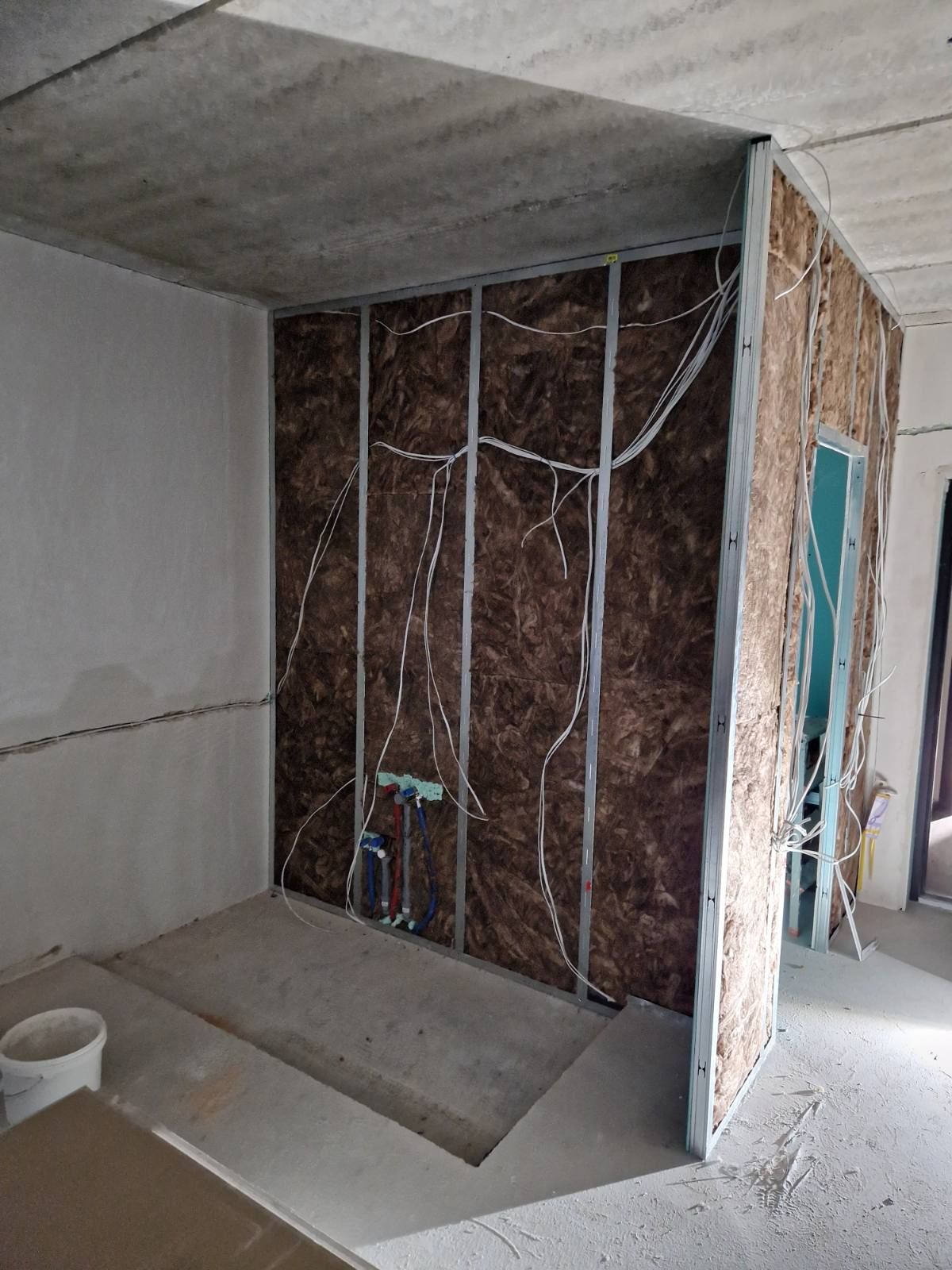 Garsą izoliuojančios medžiagos įrengimas ir savarankiška elektros instaliacija pertvaroje (jungikliai, rozetės integruojami montavimo metu).
